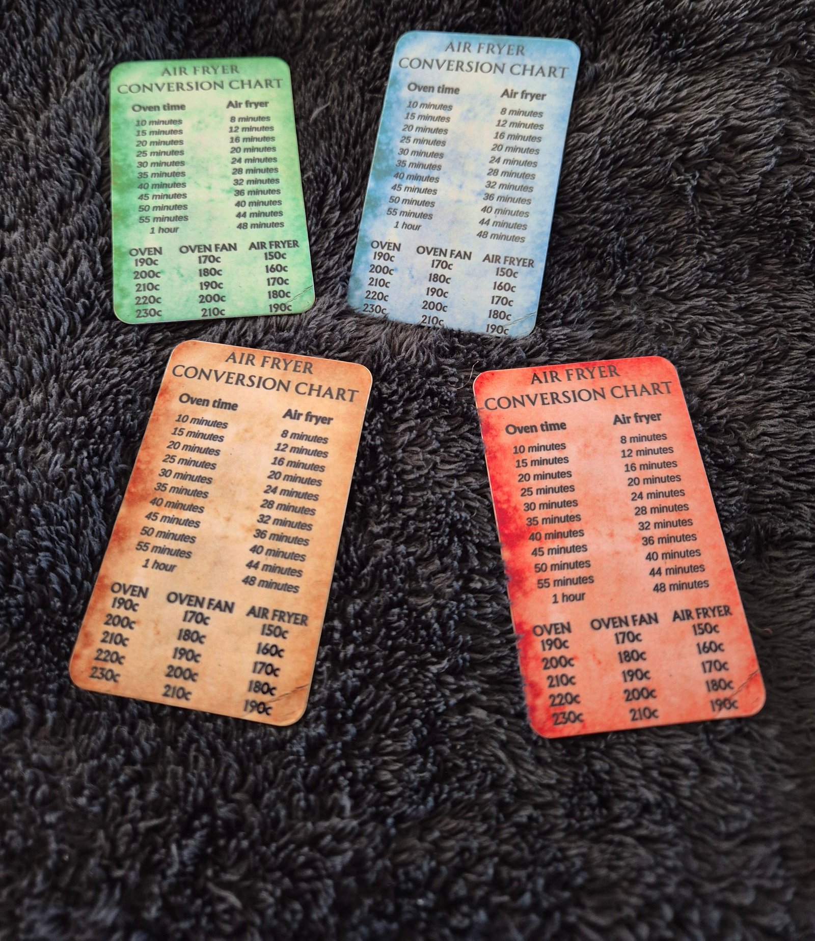 These handy magnets can be placed in your kitchen to take the guess work out of using an air fryer when your food product does not have the conversion times and temps displayed.